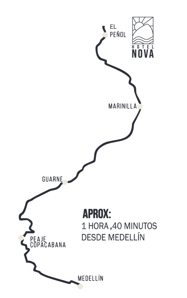 Para salir de Medellín, puede tomar la Avenida Las Palmas hasta conectar con la autopista Medellín–Bogotá, o incorporarse directamente a esta vía a la altura de Zamora. En el municipio de Marinilla, deberá tomar el retorno número 17, conocido como La Esperanza, y continuar por la vía Marinilla–El Peñol. Una vez en el casco urbano de El Peñol, avance aproximadamente cinco minutos por la vía El Peñol–Guatapé; encontrará nuestro hotel a mano derecha, justo después del primer puente.